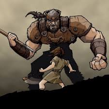 Samuel, instruído por Deus vai secretamente até a casa de Jessé para ungir um novo rei para Israel. Apesar de Davi ser o mais novo de seus sete irmãos ele foi o escolhido por Deus para ser ungido. A bíblia relata que nessa época um "mau espírito" atormentava Saul e seus servos buscaram alguém que soubesse tocar lira para que Saul se acalmasse. Saul se afeiçoou por David e fez dele seu escudeiro. Mais tarde quando o exército filisteu se reuniu para enfrentar os israelitas, um gigante chamado Golias desafiou o exército israelita a enviar um homem para enfrentá-lo, no entanto, os israelitas tiveram medo do gigante. Davi, indignando-se da vergonha que Golias trazia a Deus e a todo exército de Israel com suas palavras, decidiu enfrentá-lo. Saul ofereceu sua armadura para Davi, no entanto ele recusou por não ser treinado no combate com armadura e ser de pequena estatura em comparação à armadura (a Bíblia relata que Saul era particularmente alto dizendo que seus ombros sobressaíam acima do resto do povo), então Davi enfrentou Golias munido apenas de uma funda e algumas pedras. Logo no começo da batalha Davi acertou-lhe a testa com uma pedrada e, caindo Golias, arrancou-lhe a cabeça com sua própria espada.